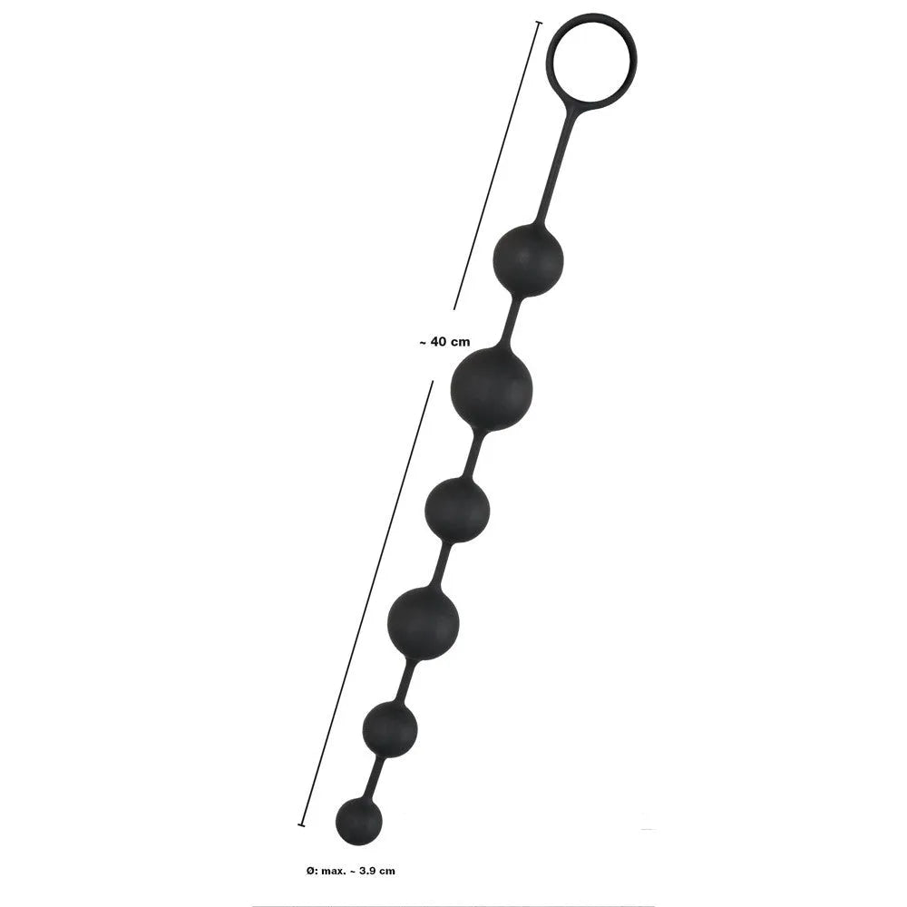 Six black beads on a chain. All the beads are different sizes (Ø 2.3-3.9 cm). Slightly flexible. With a retraction loop. Complete length approx. 40 cm. Material: silicone.