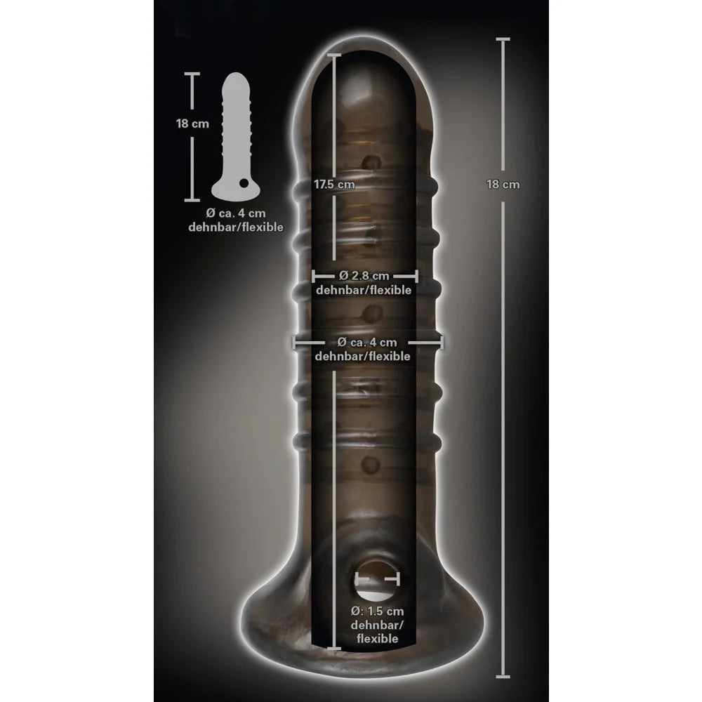 To the exterior this sleeve has ribs for extra intensity – the perfect partner pleaser when it comes to added texture. This toy fits neatly over the scrotum where it stays in place while you play. It measures 18cm in length with a girth of 11cm. It’s free from latex and phthalates and is waterproof for use in the bath, the shower and beyond. This penis sleeve can be used safely with a water based lubricant for extra stimulation. The stretchy TPE material promises a great fit.