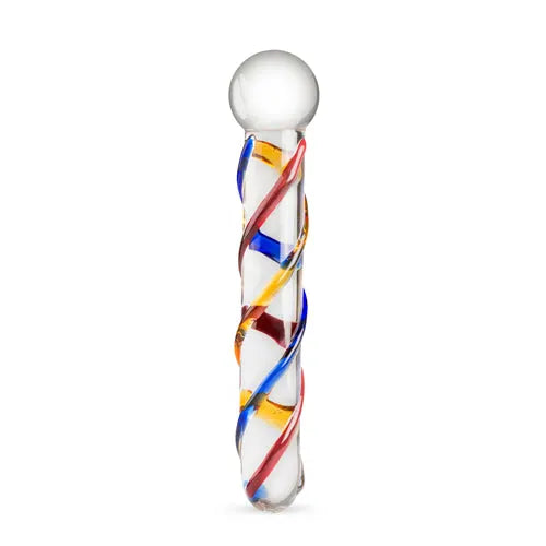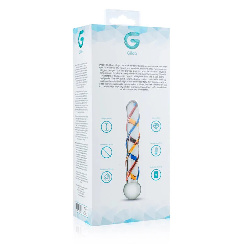 Complete your toy collection with this beautiful glass dildo from the Gildo collection. This beautiful dildo is made of transparent glass and is decorated with colored stripes that run around the shaft. These stripes simultaneously give texture to the dildo for extra stimulation with each thrust. Thanks to the non-porous material you can combine this dildo with all kinds of lubricant and it is very easy to clean hygienically with toy cleaner or mild soap and water. In addition, the dildo is also suitable for Temperature Play. Place the dildo in hot or cold water before use and the glass will quickly take on the temperature of the water. This provides extra sensations during use.