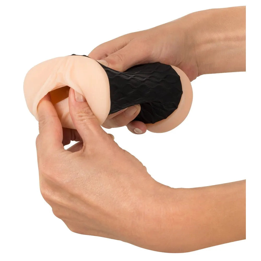 This arousing lover promises double the amount of pleasure because it has two ends! The skin-coloured masturbator has an inviting vagina opening and a plump anus opening – all you have to do is decide which opening you are in the mood for. There is a dotted pleasure tunnel behind the vagina opening and a grooved pleasure tunnel behind the anus opening. Any sized penis can fit through the openings, thanks to their flexible diameters. The material also feels wonderfully realistic as well. One thing is definitely for sure – you’ll definitely have everything in hand whichever end you decide to use because it has a black sleeve (with a texture) around it.