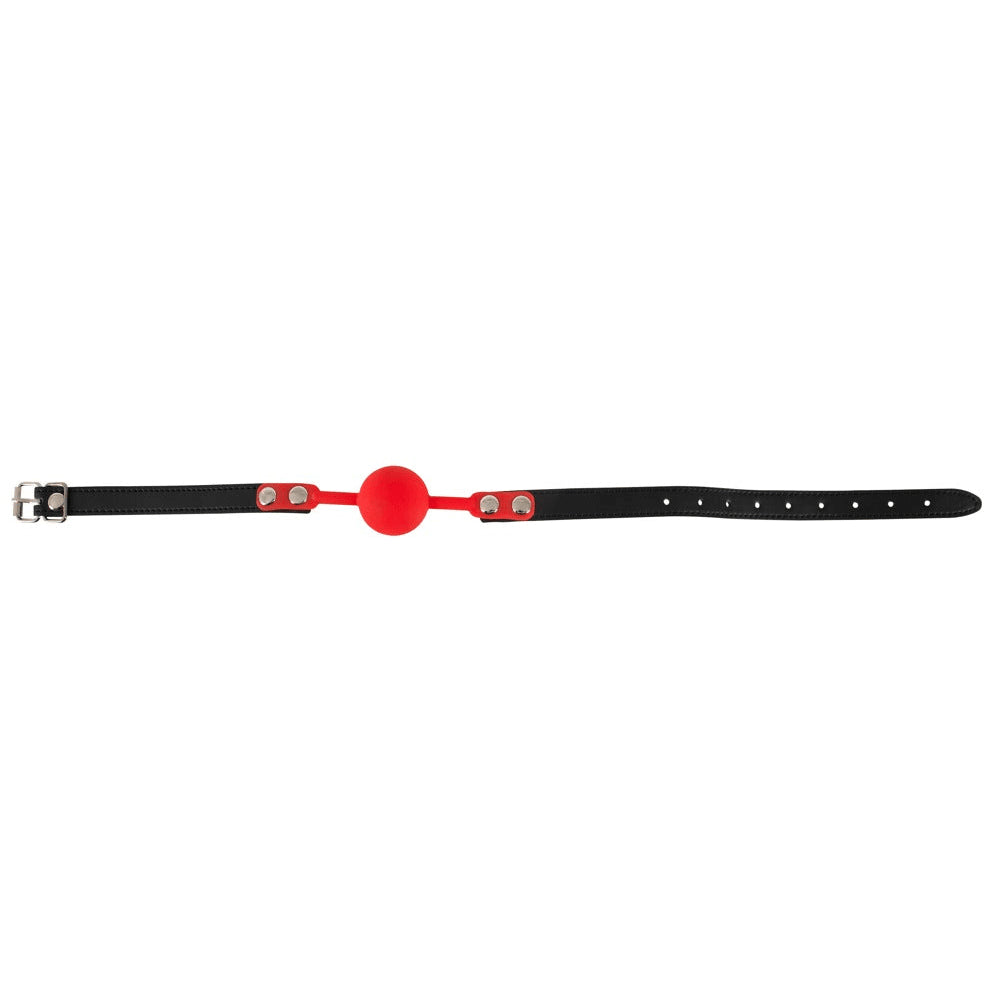 The silicone gag can be fitted perfectly so that backchat is not possible, thanks to the adjustable strap with four holes. Red gag on black imitation leather straps with a buckle. Gag Ø approx. 4 cm, circumference 42 to 58 cm. Material: polyurethane, silicone.