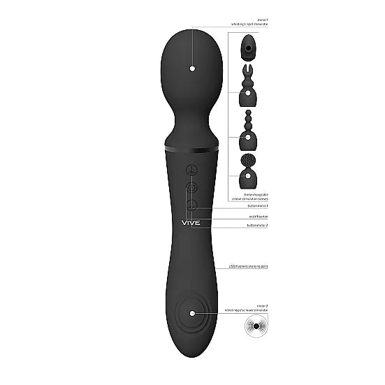 In addition, the VIVE39 comes with Four attachments to enhance your fun. Three used with the wand head for direct clitoral stimulation and one to use with the base G-Spot Pulse-Wave motor to create a Touchless Air-Waves Technology that create a sucking stimulation for your Clitoris.Combine the Two 10-function New Generation F1 motors with a possible 100 different settings plus all the extra attachments and the fun is endless. Made from 100% silky smooth medical-grade silicone (hypoallergenic), it is totally waterproof (IPX7), and extremely quiet at under 60db.